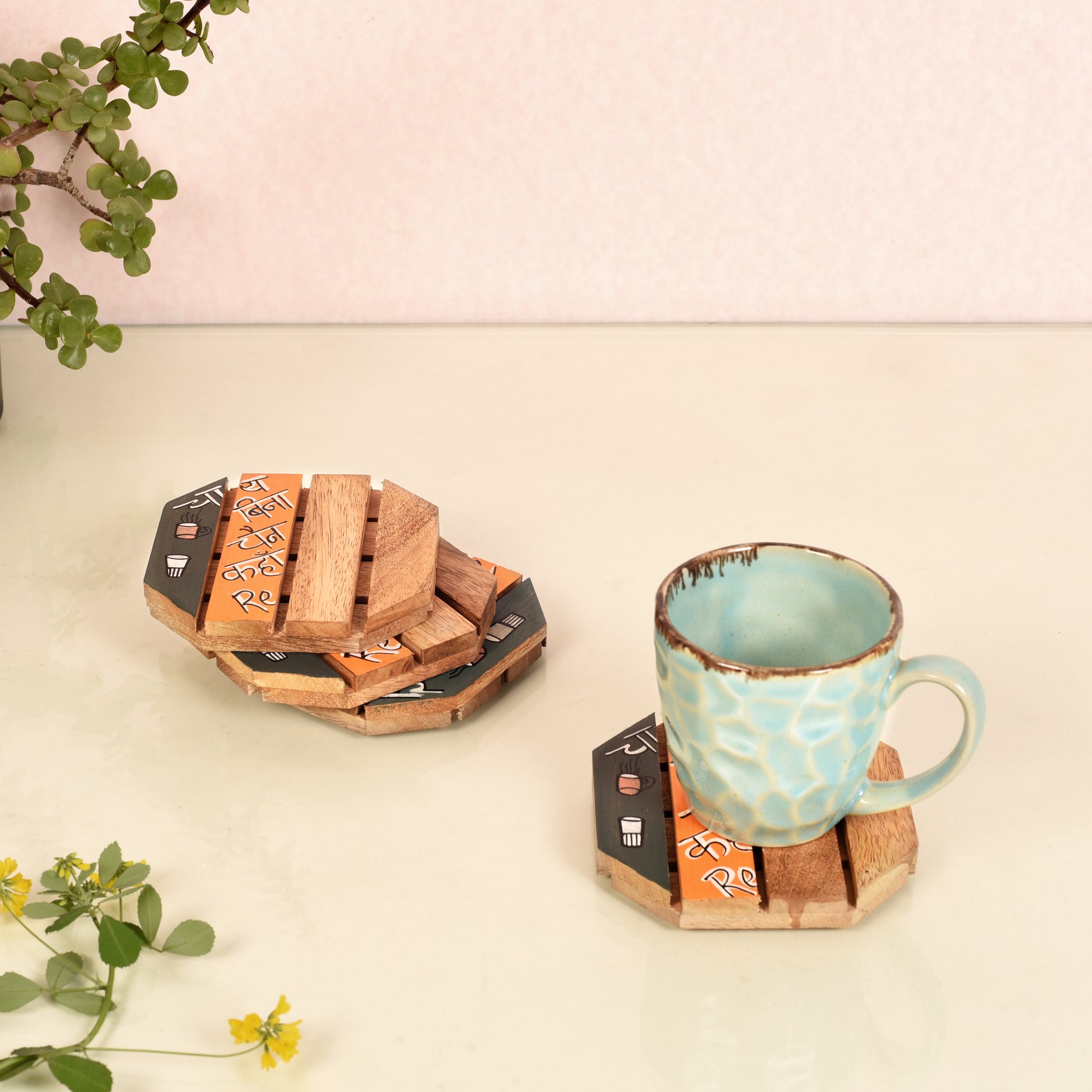 Do you crave the perfect cup of chai? Does a steaming mug bring you back to unforgettable Bollywood classics? Then you need these coasters that celebrate your love for both! Featuring the Chai-infused version of the lyrics from the unforgettable 80s Bollywood song "Yaar Bina Chain Kahan Re" (thank you Bappi Da!) - these wooden coasters will protect your table from spills while adding a touch of musical nostalgia.
