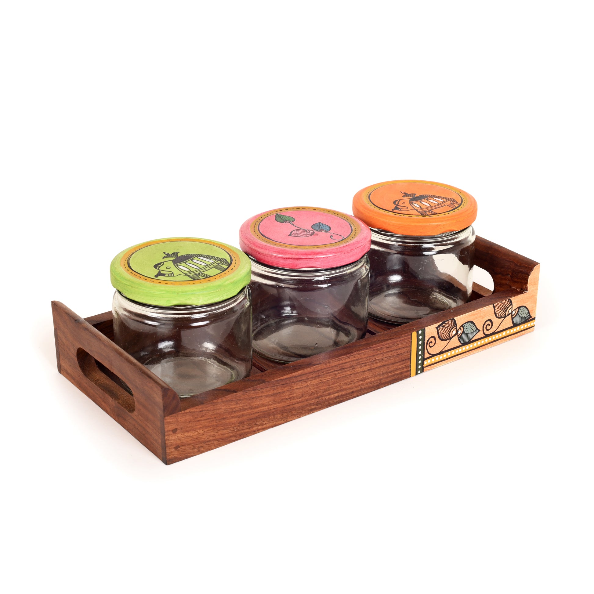 This exquisite set of 3 glass jars nestled in a handcrafted wooden platter is more than just a storage solution; it's a captivating piece of art. Each jar lid is adorned with intricate Madhubani designs, a traditional Indian art form known for its vibrant colors and bold patterns.