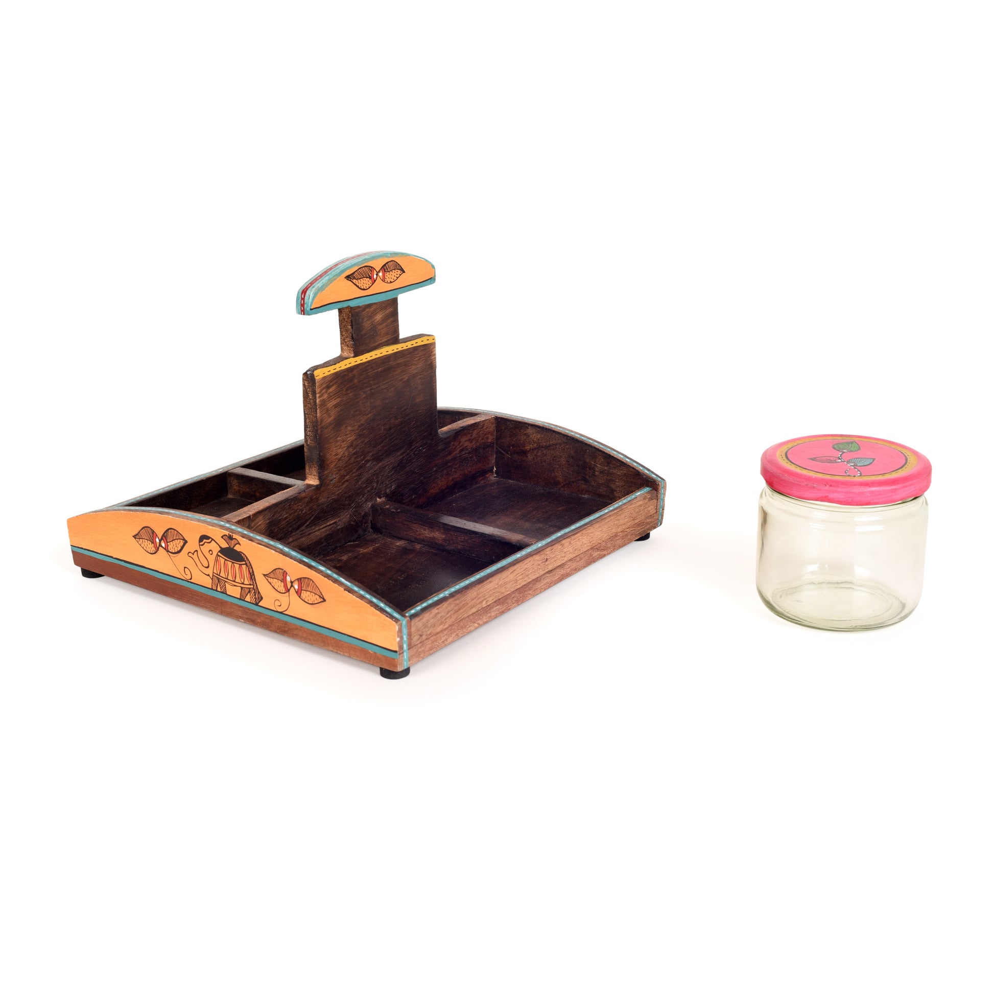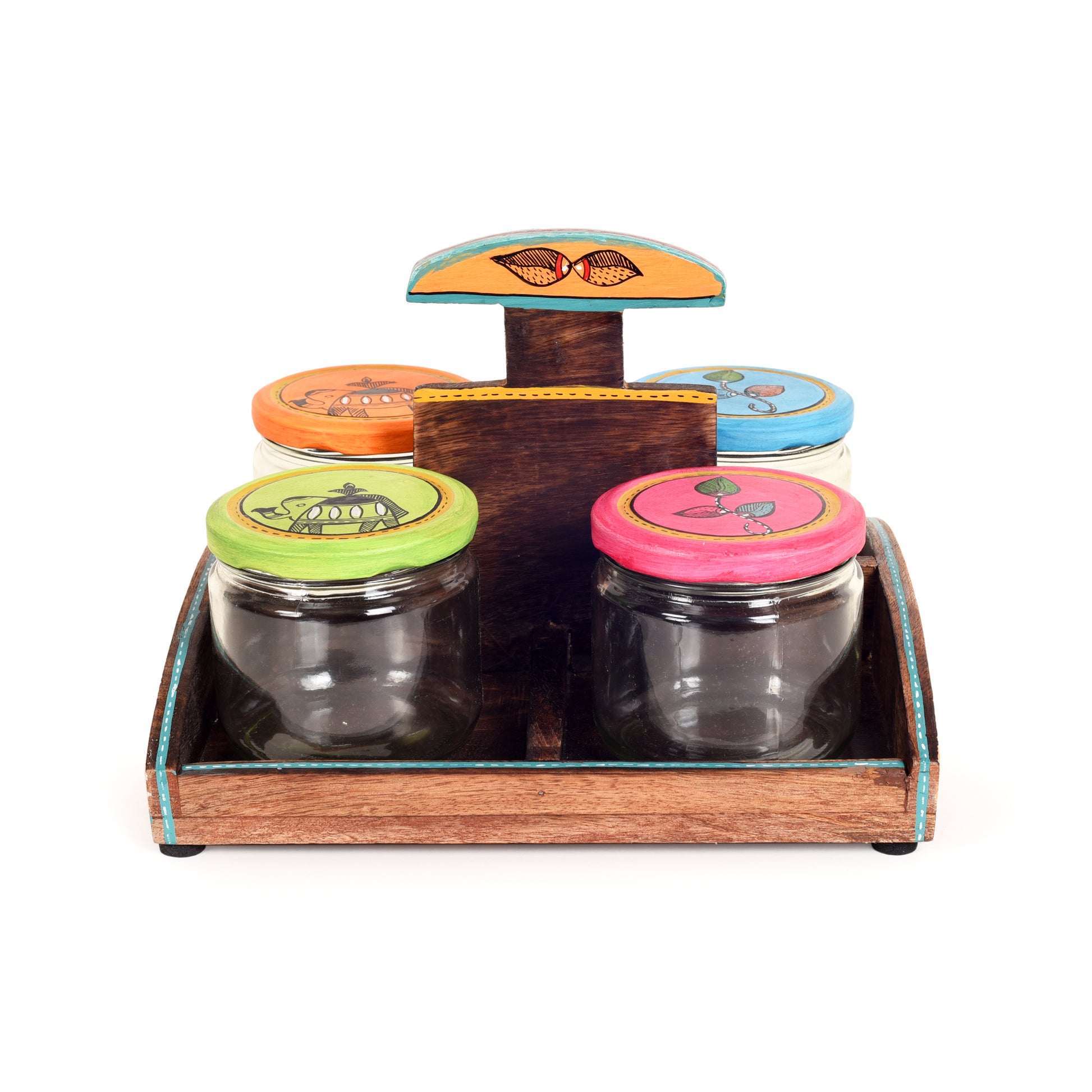 Indulge in the vibrant artistry of Madhubani with the Madhubani Munchies Quartet! This delightful set features four generously sized jars adorned with captivating Madhubani art, a unique folk art form from India. The matching carrier tray, also graced with Madhubani motifs, adds a touch of cultural flair to your kitchen countertop.