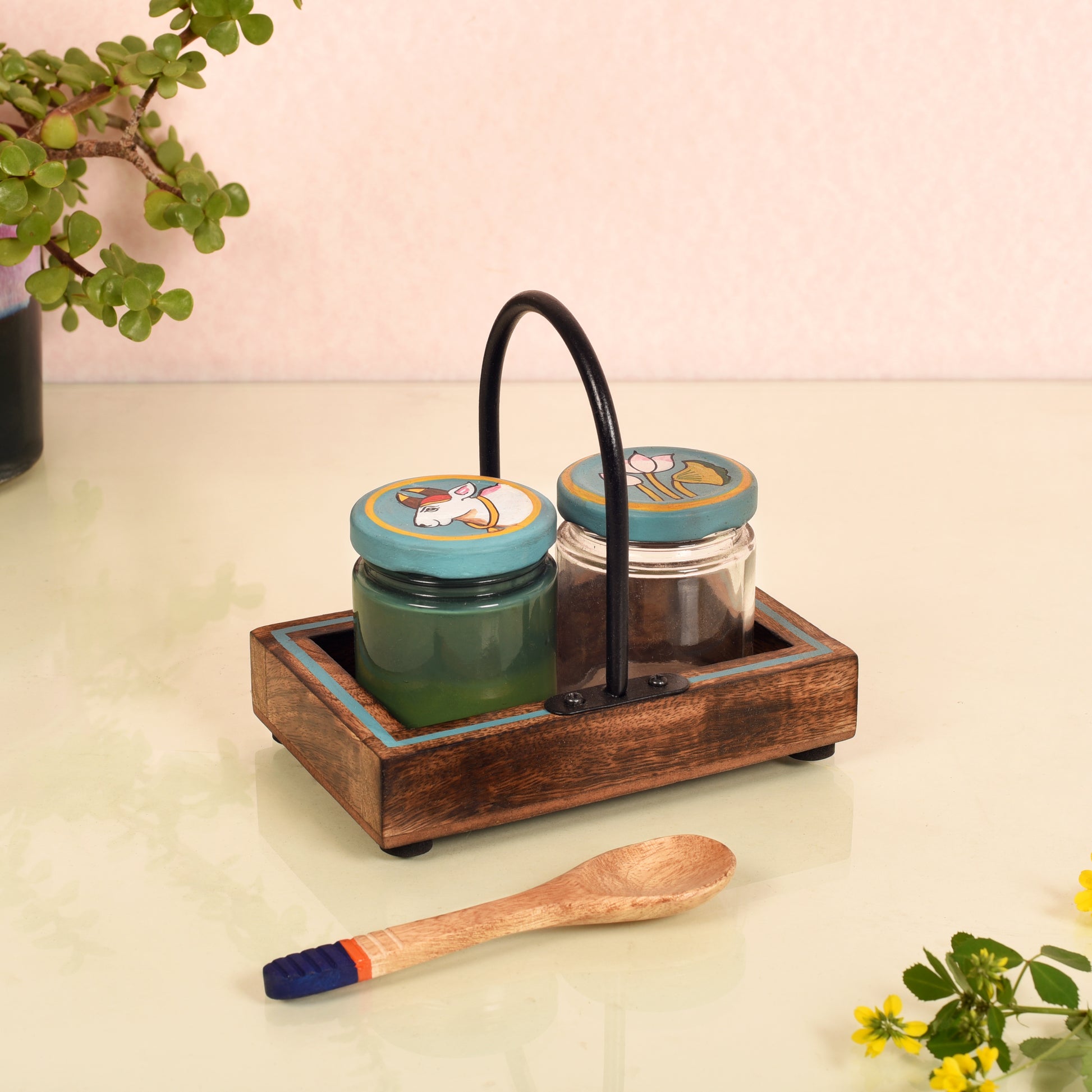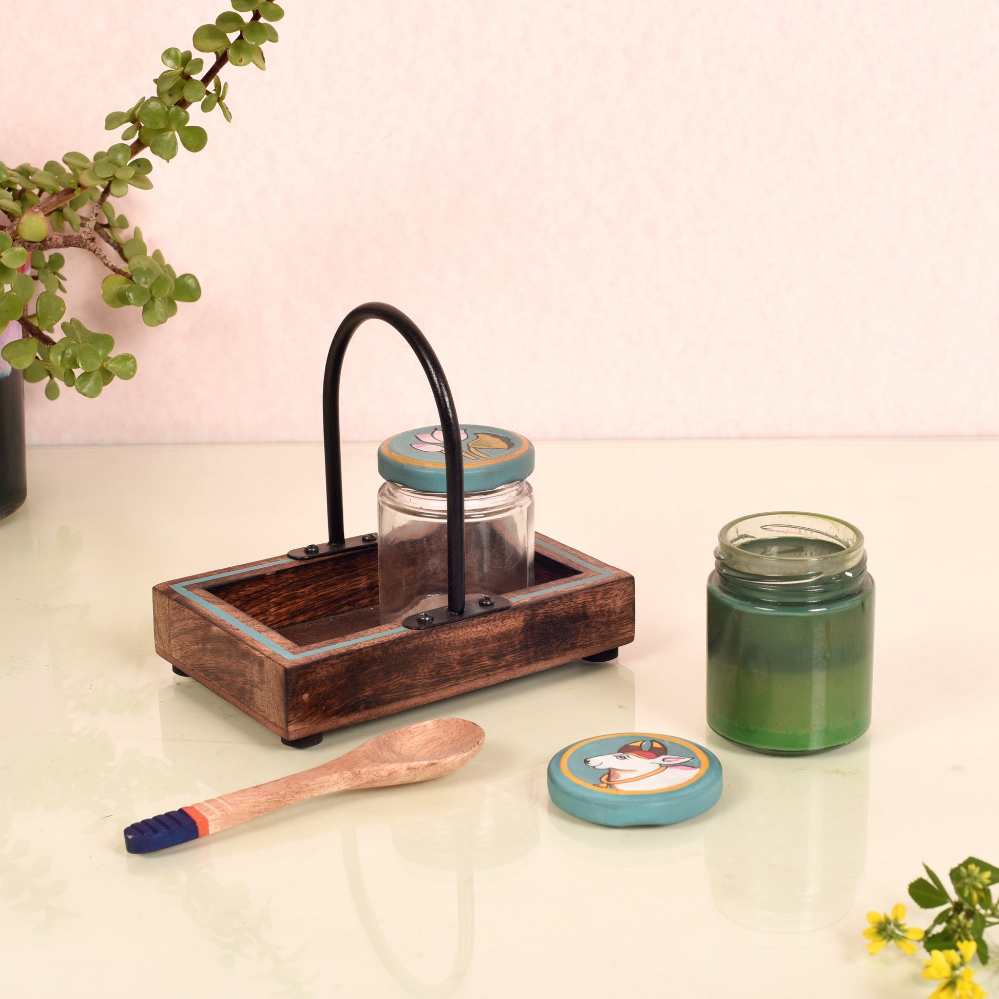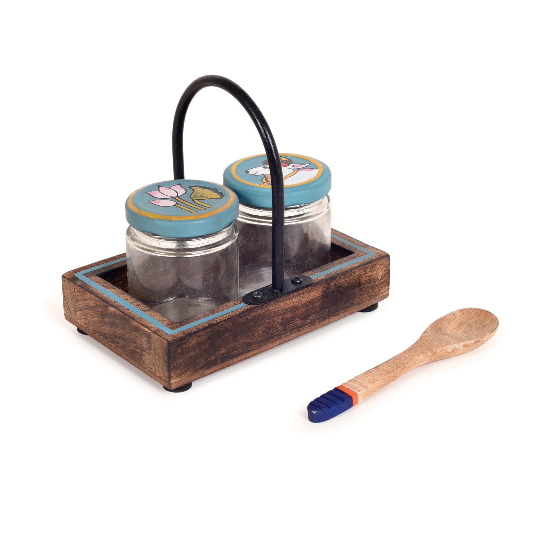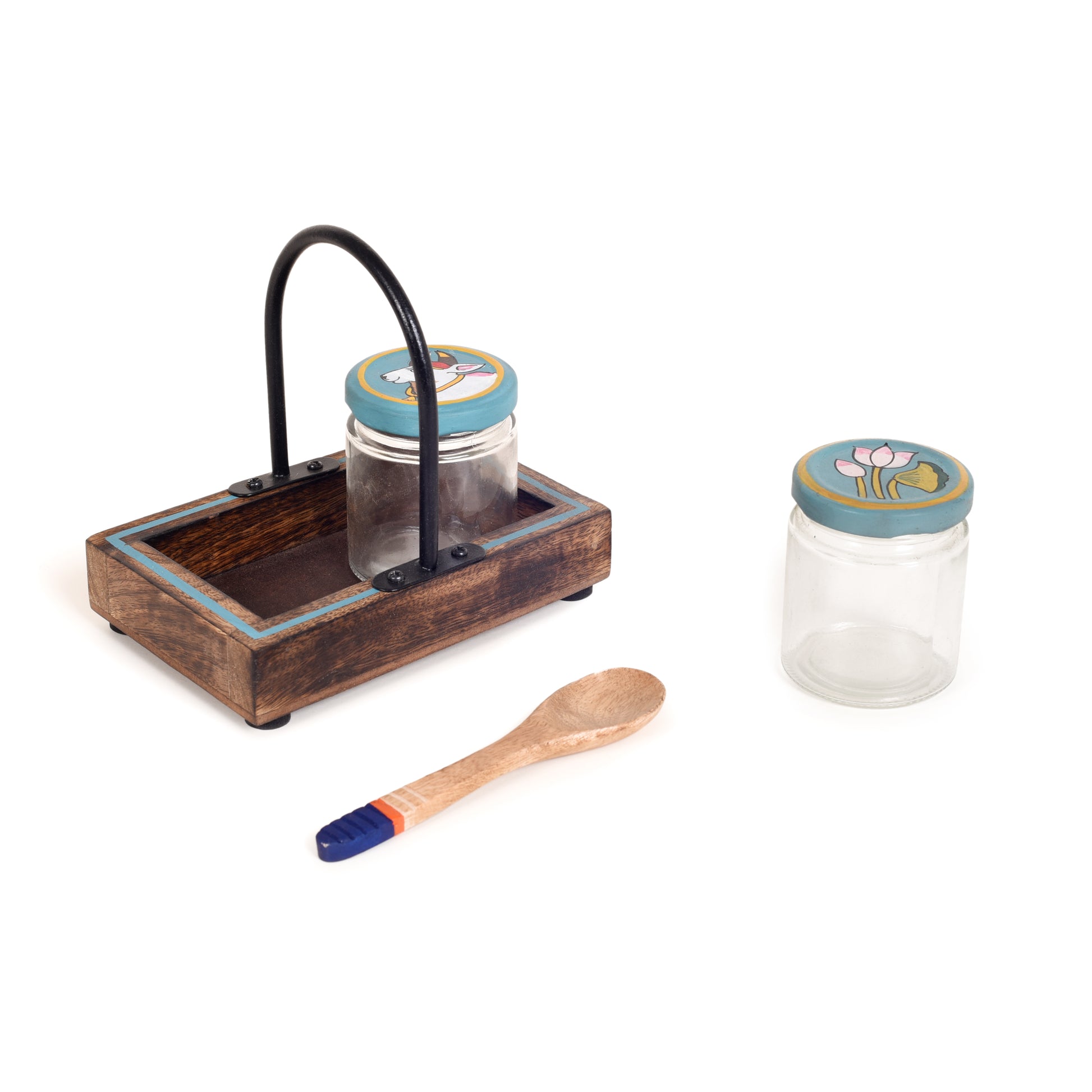 Enhance your dining table with this exquisite Pichhwai Mukhwas Duo. The set includes two glass jars, adorned with beautiful Pichhwai art motifs on their lids, and a stylish wooden tray. Perfect for storing and serving your favorite mukhwas or other small snacks, this duo is both functional and decorative. The vibrant colors and intricate details of the Pichhwai art add a touch of elegance to any setting.