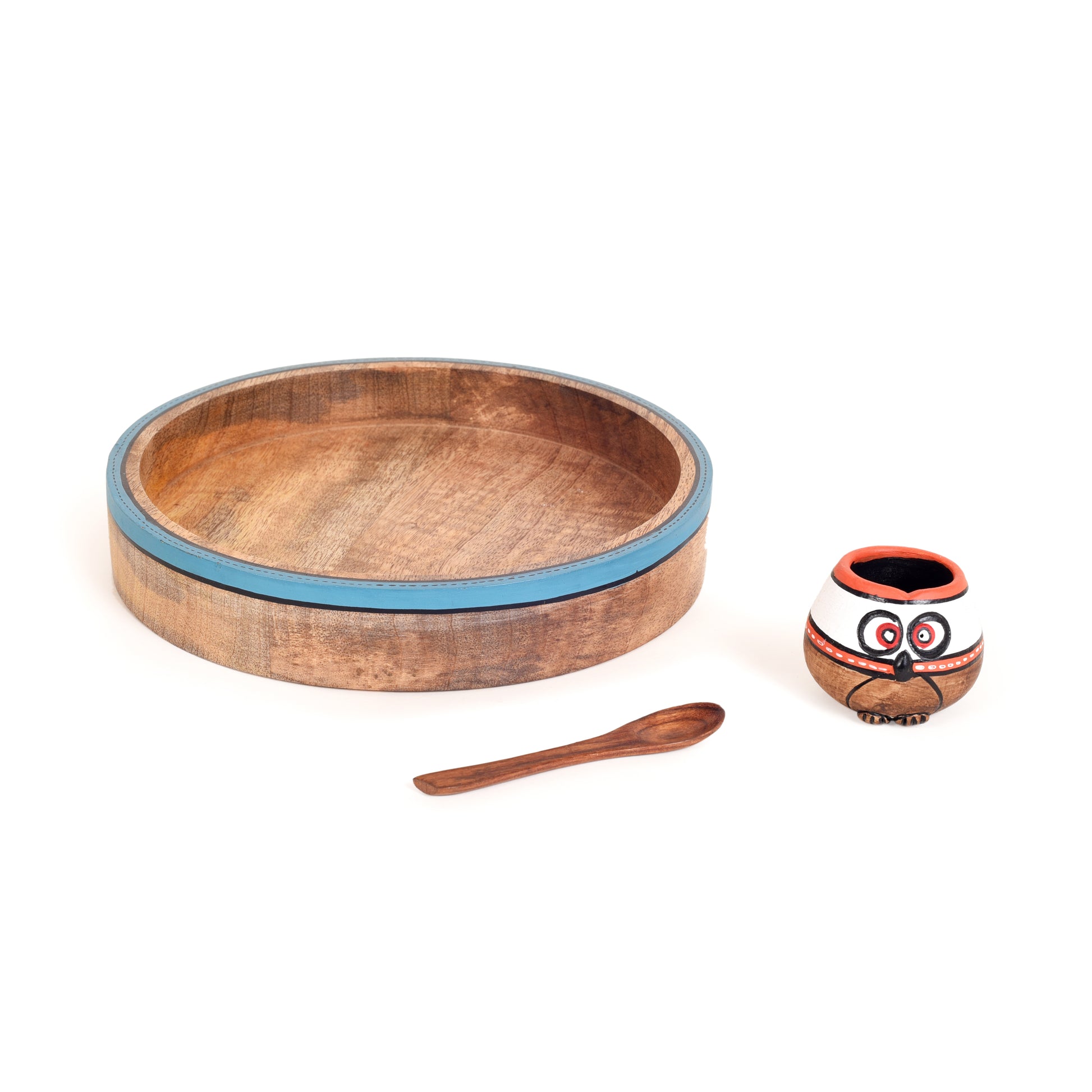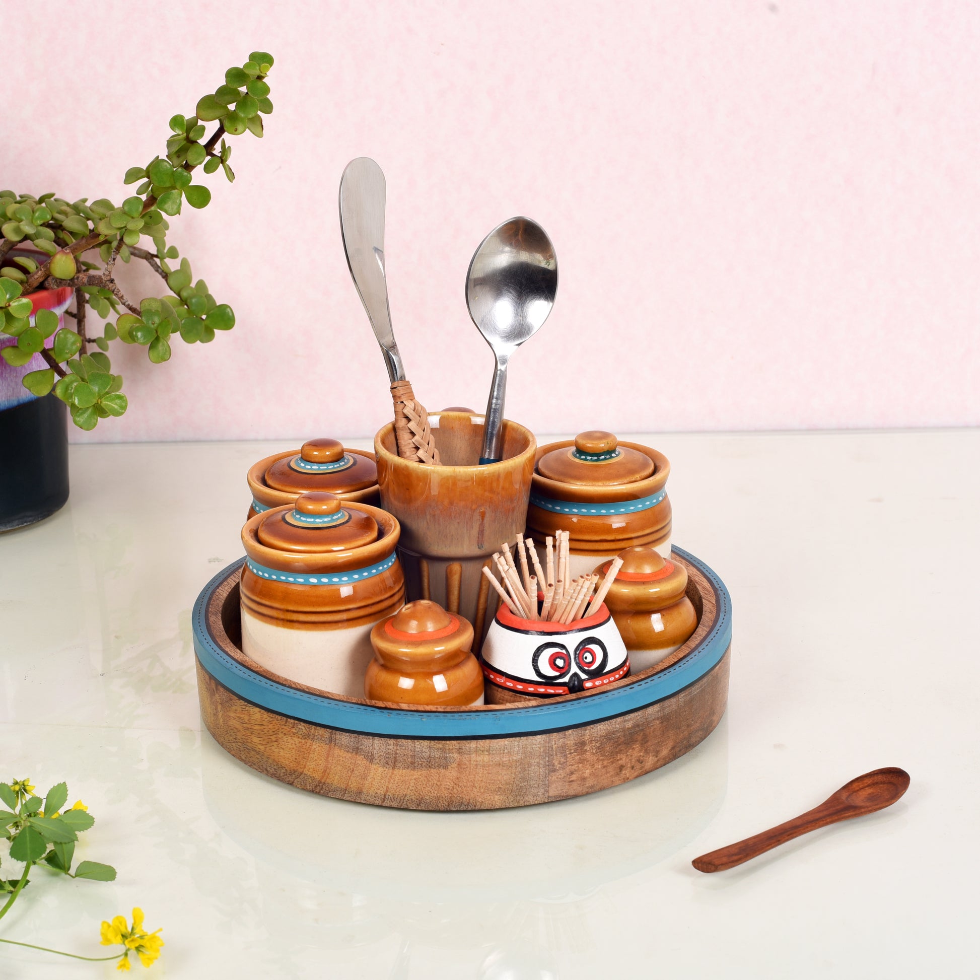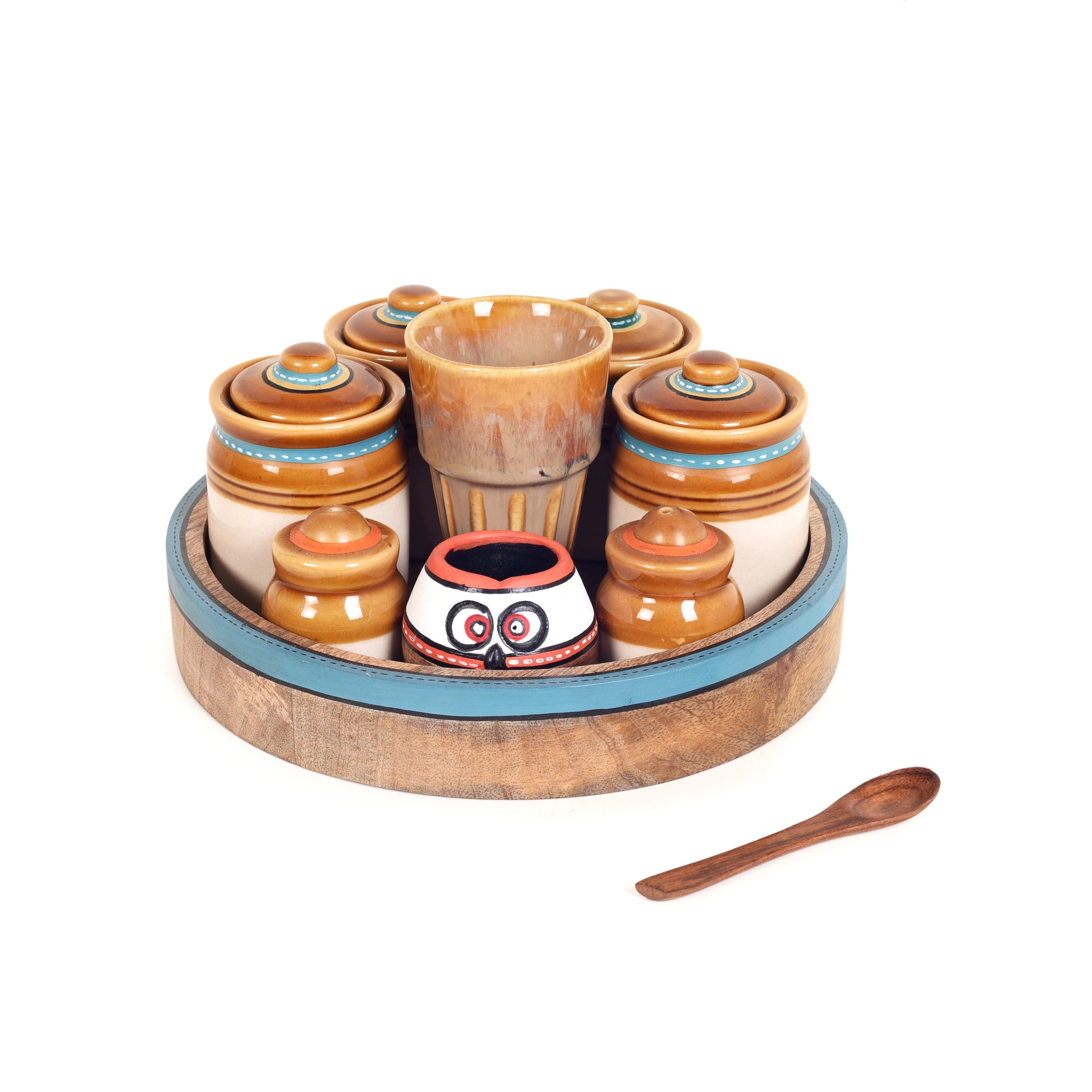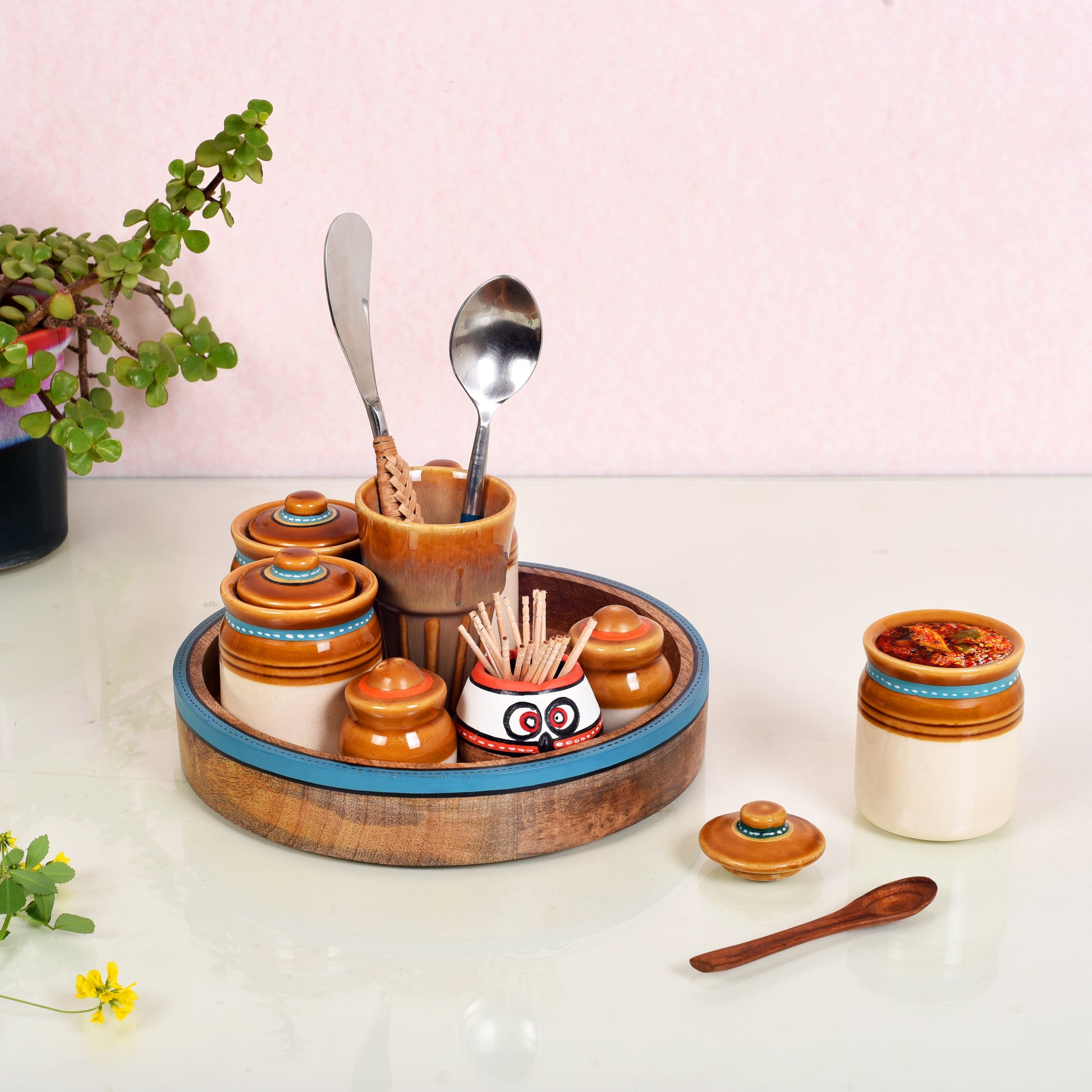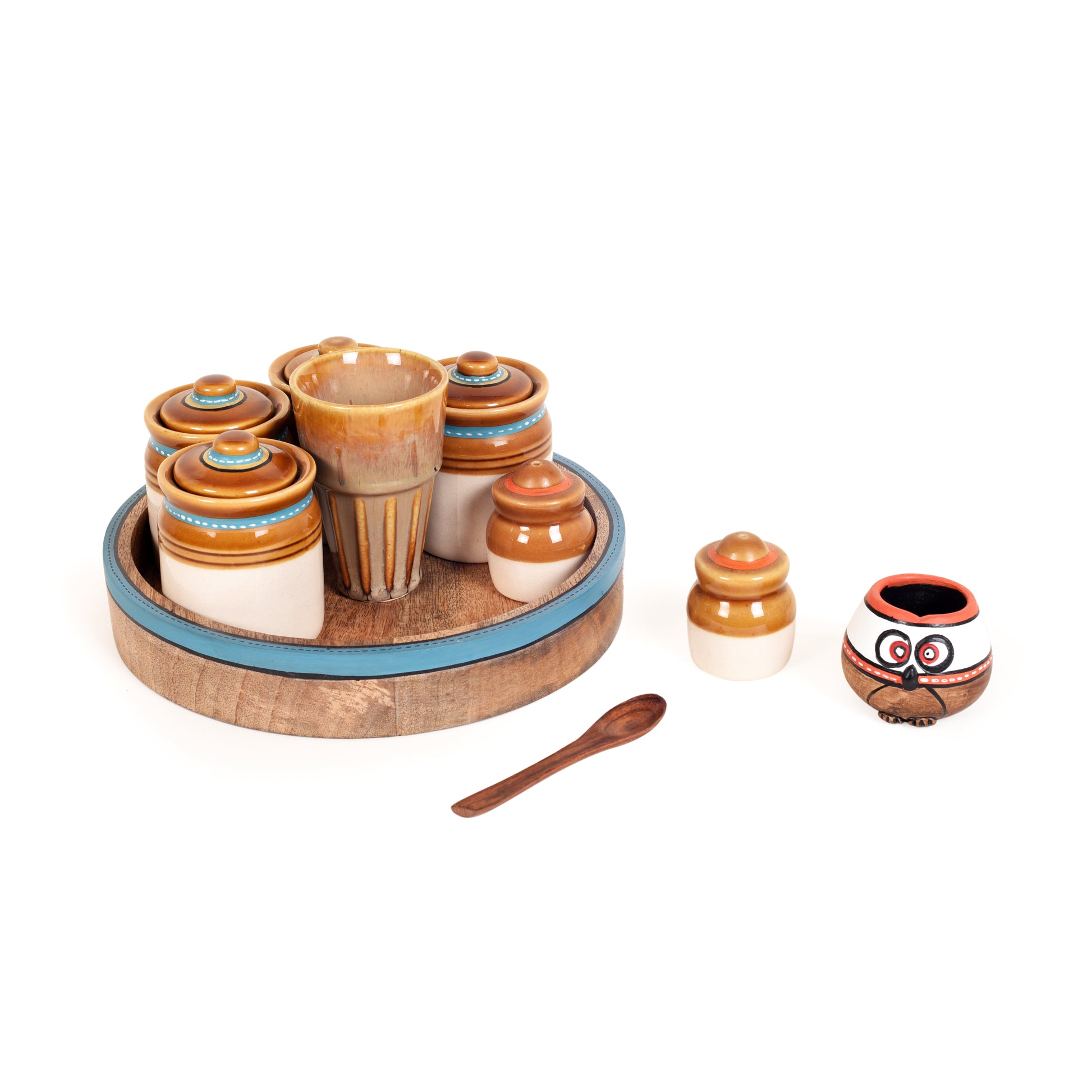 Introducing the Swaad ka Pitara - a delightful tabletop set designed to bring a burst of tradition and flavor to your dining experience. This set features four mini barnis, perfect for storing a variety of achaars (pickles), offering a nod to the larger, traditional vessels used for pickle seasoning in Indian households. It also includes a convenient pair of salt and pepper shakers and a charming owl-shaped terracotta cup to hold toothpicks. Compact yet full of character, the Swaad ka Pitara is an elegant and functional addition to your table, perfect for enhancing the flavor of every meal.