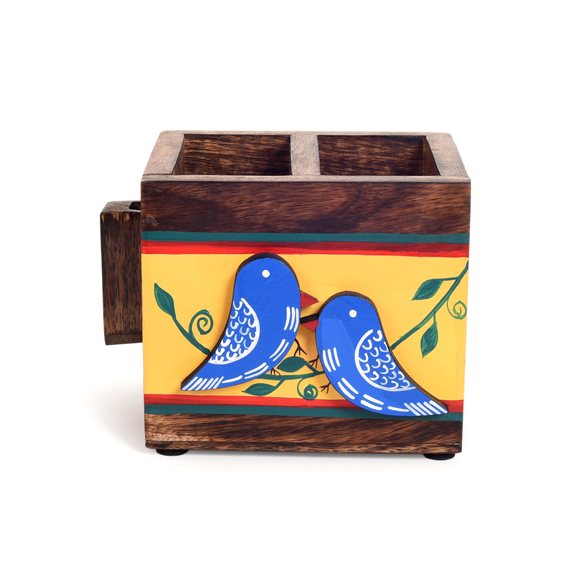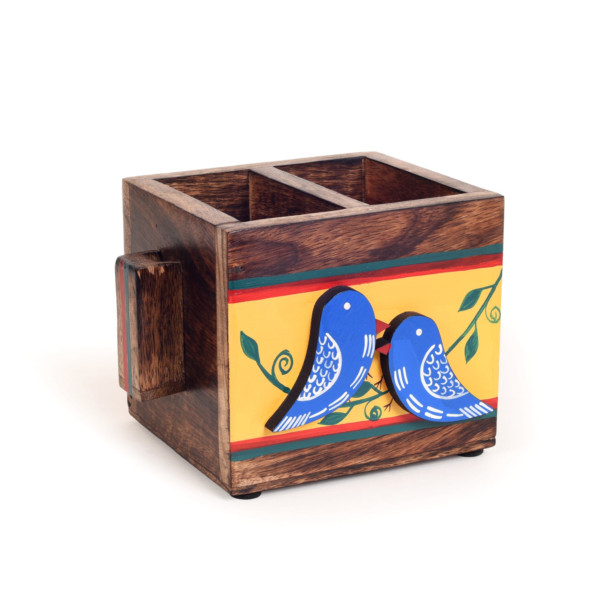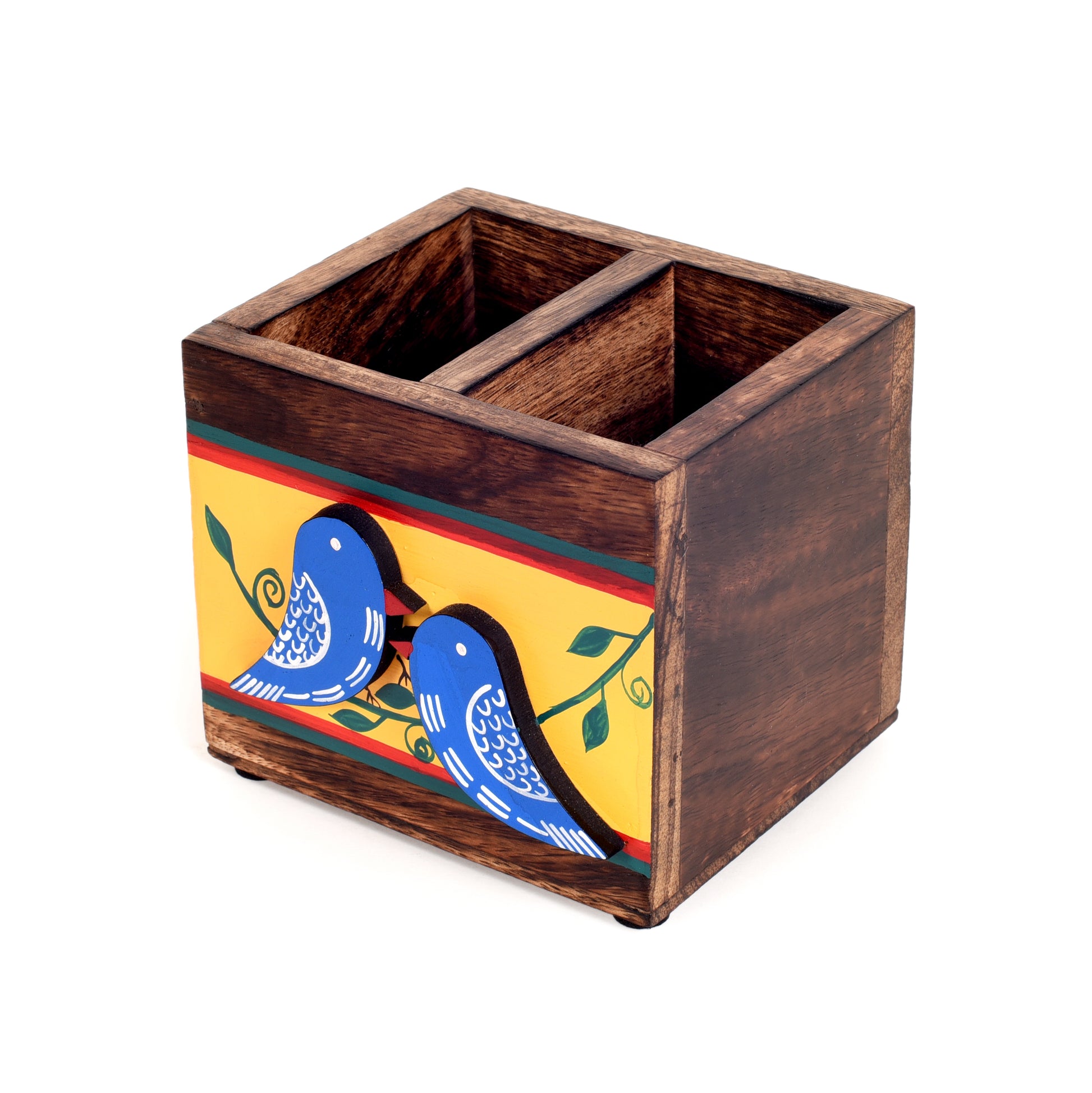 Bring a splash of playful charm to your dining table with this adorable cutlery holder. Crafted from durable mango wood, this holder features two charming birds perched on a branch, hand-painted in vibrant colors. The two slots provide ample space for your cutlery, keeping your kitchen essentials organized and easily accessible. There is also a small toothpick holder slot as well. This functional and decorative piece is a perfect addition to any home, adding a touch of personality and charm to your mealtime experience.